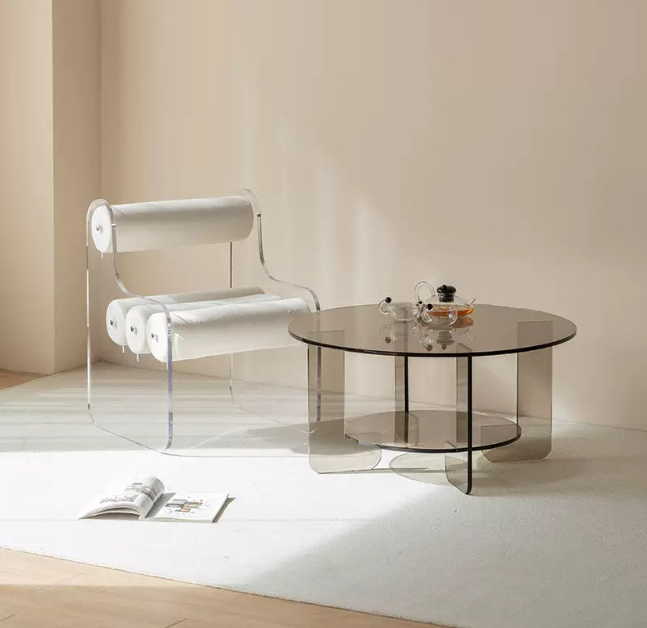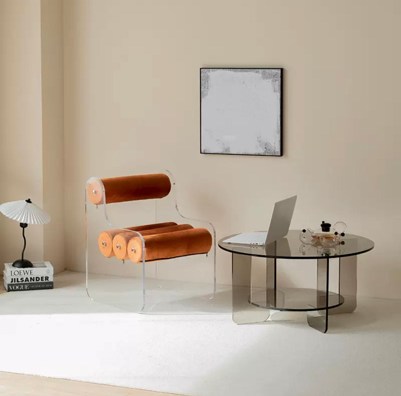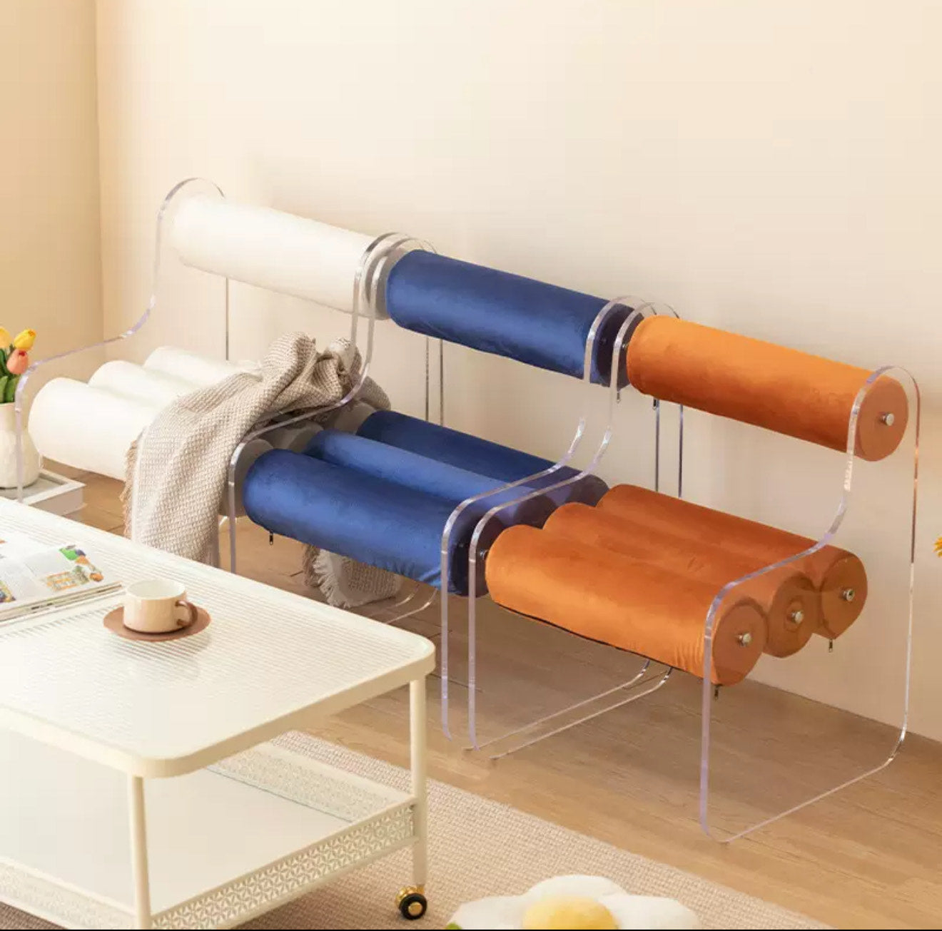 The Aero Roll Chair brings a bold and sculptural expression to contemporary seating. Crafted from transparent acrylic, its frame feels light and almost invisible — allowing the cylindrical cushions to become a floating visual feature. The result is a striking contrast: soft, plush velvet rolls supported by a clean, modern acrylic form.