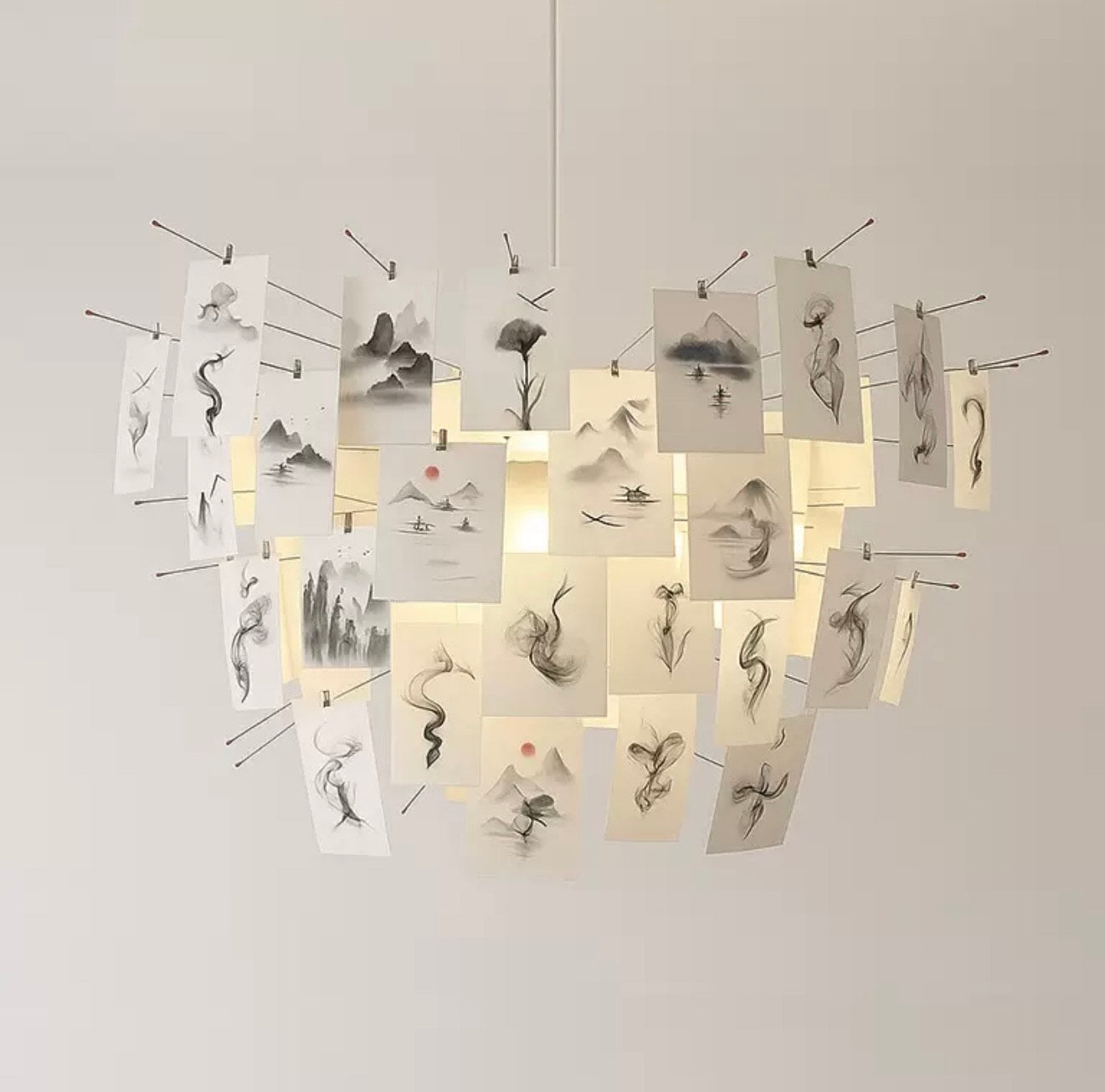 The chandelier transforms illumination into poetry: sheets of Japanese paper float around a light source, allowing the owner to personalize the fixture with handwritten notes, drawings, or printed artwork, making each piece a unique installation.